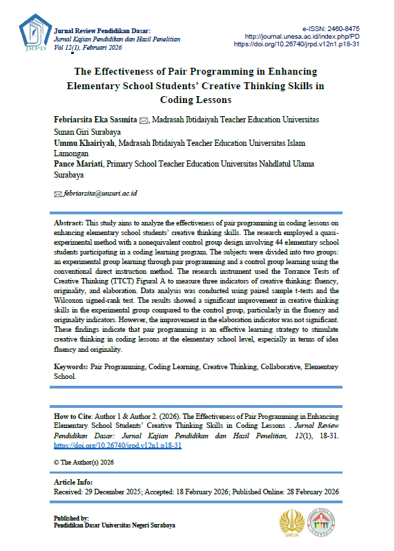 The Effectiveness of Pair Programming in Enhancing Elementary School Students’ Creative Thinking Skills in Coding Lessons