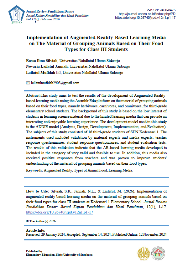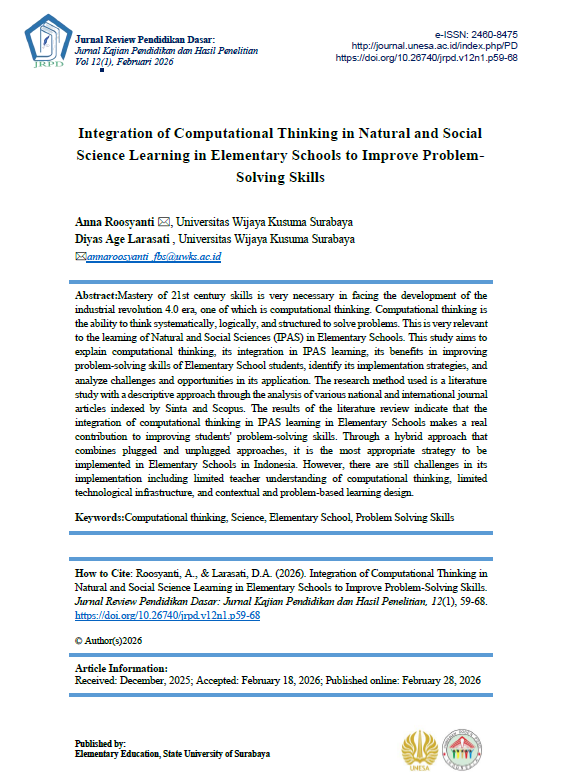 Jurnal Review Pendidikan Dasar : Jurnal Kajian Pendidikan dan Hasil Penelitian has been accredited SINTA 4 by National Journal Accreditation (ARJUNA) Managed by Ministry of Higher Education, Science, and Technology Republic Indonesia. Decree No: 10/C/C3/DT.05.00/2025
